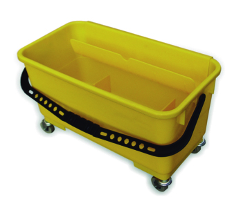 Cubo rectángular con ruedas, fabricado en PVC de color amarillo.
